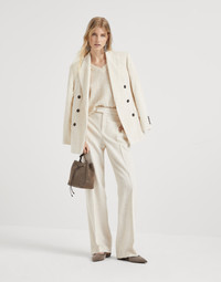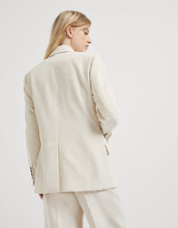Luxurious viscose and cotton corduroy refines the classic feel of this blazer, inspired by tailored double-breasted silhouettes. A fine shiny monili embroidery illuminates the back of the neck with the iconic element of the Brunello Cucinelli collections. The shape is slightly elongated with regular proportions through the shoulders and chest. MATERIALS In the new corduroy, viscose threads give sheen and fluidity to the garment, while cotton provides softness. A silk-blend crêpe lining provides added comfort. DETAILS Horn button closure Silk-blend crêpe lining Welt pockets with flap and chest pocket Cuffs have four horn buttons Single back vent Peak lapel Nickel-free monili decoration 55% VISCOSE, 45% COTTON