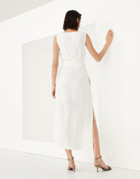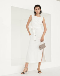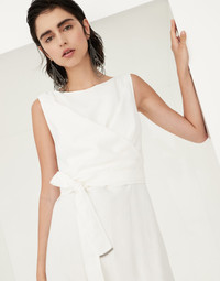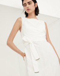 Femininity, comfort and modernity define the Fluid twill Wrap Effect dress. A soft side gathering creates a dynamic movement and brings to mind the feminine details of wrap silhouettes. Two subtle monili details on the edges of the belt complement the garment with a little sparkling touch. MATERIALS The combination of viscose and linen gives this twill a lightweight, flowing yet slightly crushed appearance. The characteristics of the fabric are further highlighted by the nuanced color variations. DETAILS Concealed back zip closure Boat neck Attached tie belt Nickel-free monili decoration 73% VISCOSE, 27% LINEN