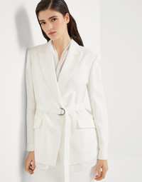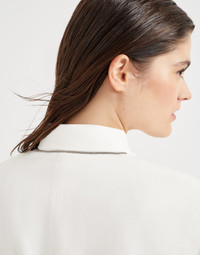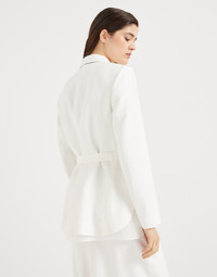 Refined materials and tailored details define this viscose and linen Fluid twill blazer. Inspired by the world of safari jackets, the garment features peak lapels and a concealed button closure for an essential feel, while the volume is gathered at the waist by a belt. The elegant monili embroidery adds a delicate sparkle in true Brunello Cucinelli style. MATERIALS The combination of viscose and linen gives this twill a lightweight, flowing yet slightly crushed appearance. The characteristics of the fabric are further highlighted by the nuanced color variations. DETAILS Internal snap closure Silk-blend crepe lining Peak lapel Chest pocket Hand pockets with flap Side vents at bottom Detachable belt with loops Nickel-free monili decoration 73% VISCOSE, 27% LINEN