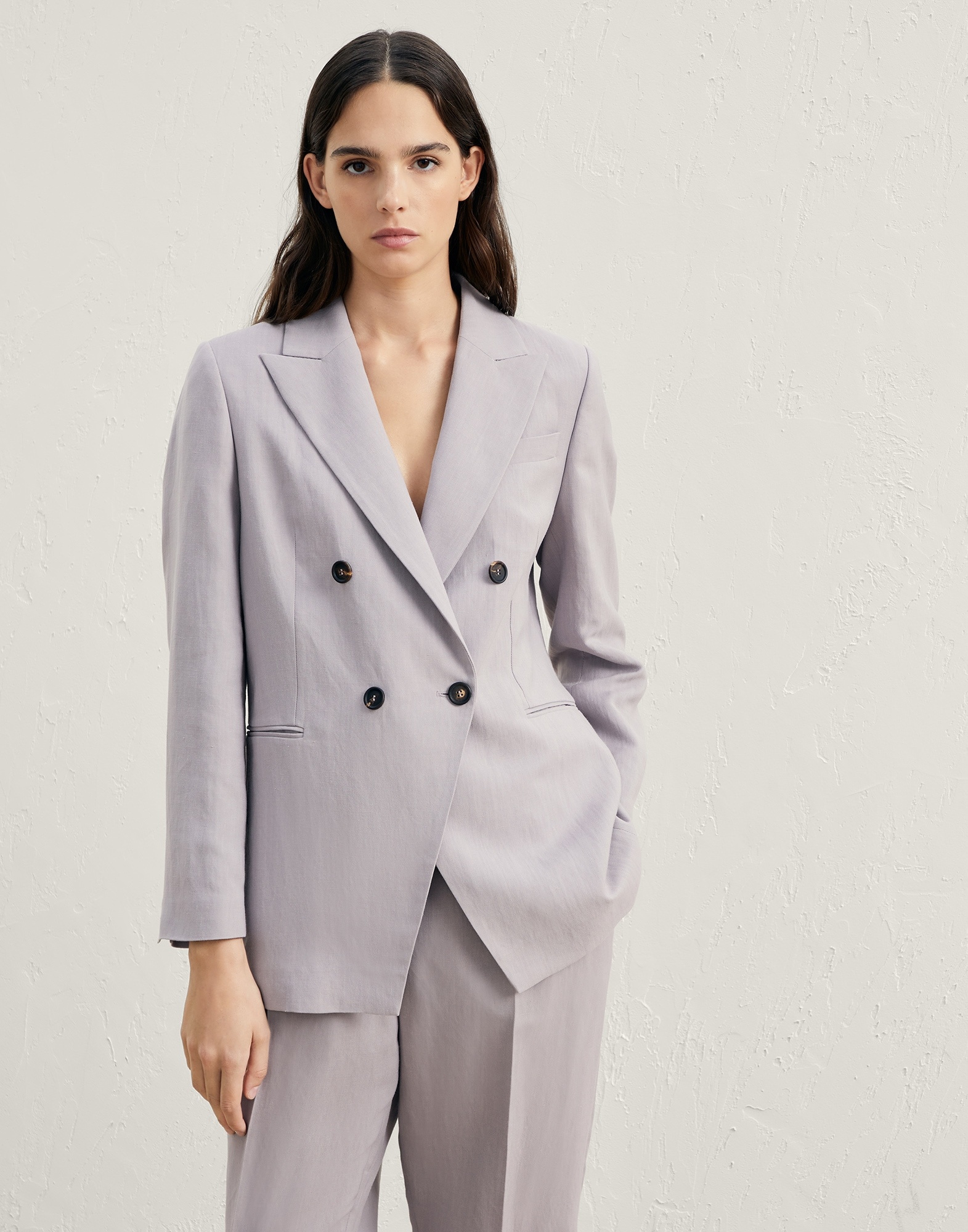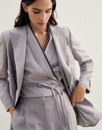 Sartorial foundations and a feminine twist: lightweight summery fabrics, distinguished craftsmanship and informal elements come together to create outfits with ease. Designed to be worn with everything and at any time of the day, blazers in a wide variety of styles and volumes are a key element in expressing new concepts of female elegance. MATERIALS The combination of viscose and linen gives this twill a lightweight, flowing yet slightly crushed appearance. The characteristics of the fabric are further highlighted by the nuanced color variations. DETAILS Horn button closure Silk-blend crêpe lining Cuffs with horn buttons Welt hand pockets Nickel-free monili decoration 73% VISCOSE, 27% LINEN