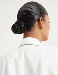 The viscose and linen Fluid twill reinterprets a timeless icon of classic style. The smooth fabric gives a feminine feel to the garment, which features elegant tailored peak lapels and flap pockets. The refined monili embroidery behind the neck adds a delicate sparkle in true Brunello Cucinelli style. MATERIALS The blend of viscose and linen gives the twill a lightweight, very fluid appearance that is semi-crisp at the same time. DETAILS Horn button closure Silk-blend crepe lining Hand pockets with flap Single back vent Nickel-free monili decoration 73% VISCOSE, 27% LINEN