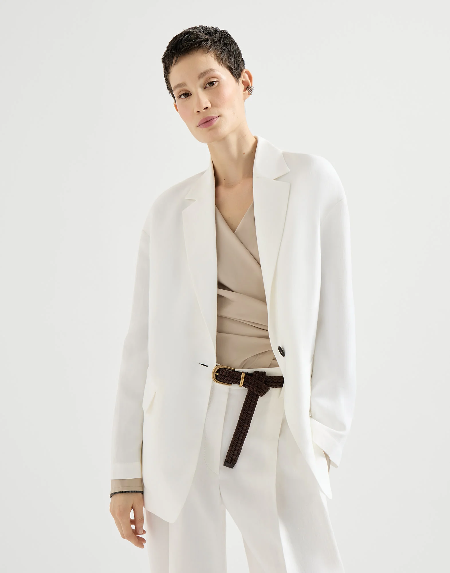 Precious embellishments and the season’s colors define this viscose and linen fluid twill blazer. The lightweight, flowing fabric enhances the silhouette, completed with classic lapels and large flap pockets inspired by the world of safari jackets. A thin belt gather’s the volume of the design and highlights the waist, while the iconic shiny monili embroidery adds a sparkling note in true Brunello Cucinelli style. MATERIALS The blend of viscose and linen gives the twill a lightweight, very fluid appearance that is semi-crisp at the same time. DETAILS Horn button closure Notched lapel Hand pockets with flap Single back vent Detachable tie belt Nickel-free monili decoration 72% VISCOSE, 28% LINEN