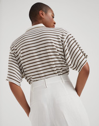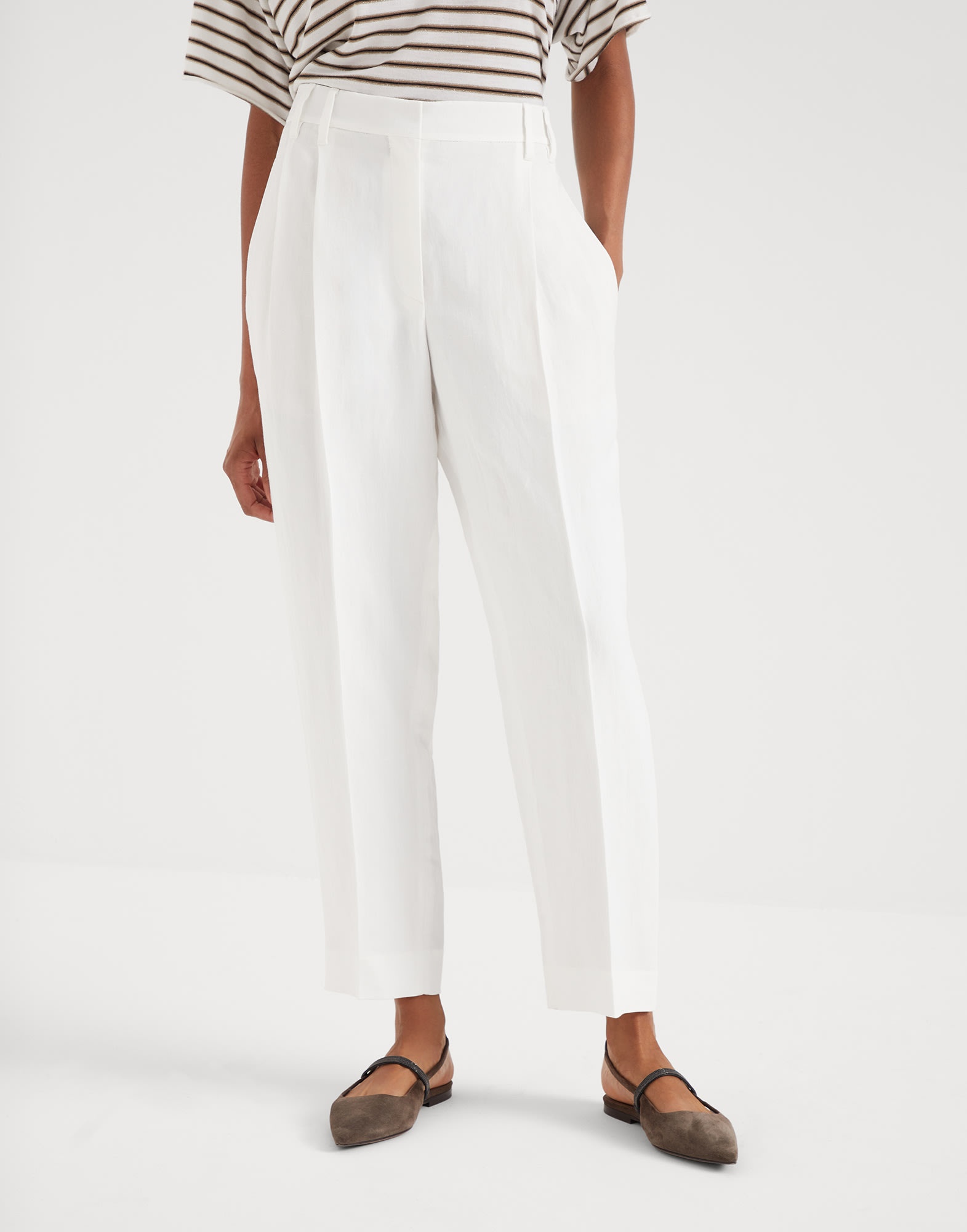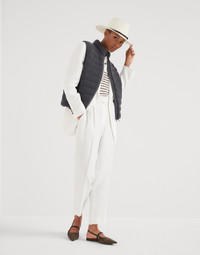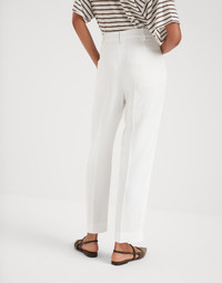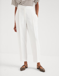 The relaxed lines of the Slouchy silhouette are paired with tailored details in these viscose and linen Fluid twill trousers. The material’s typical flowing appearance is combined with the double pleats and rear welt pockets details. A shiny monili embroidery illuminates the rear belt loop with a precious note. MATERIALS The combination of viscose and linen gives this twill a lightweight, flowing yet slightly crushed appearance. The characteristics of the fabric are further highlighted by the nuanced color variations. DETAILS Zip closure with metal hook and backing button Front pockets Back welt pockets Double pleat Nickel-free monili decoration 73% VISCOSE, 27% LINEN