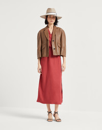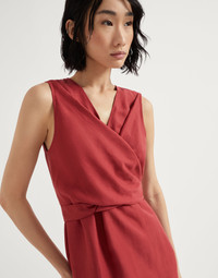 Relaxed elegance and comfortable volume define this Wrap-Effect dress in Fluid twill, an informal yet sophisticated fabric. A soft layering on the side creates a dynamic sense of movement and is reminiscent of wrap silhouettes, while the light, fluid fabric complements the straight lines, completed at the bottom by two very feminine slits. The sparkling monili embroidery on the ends of the belt completes the garment with an elegant sparkle in true Brunello Cucinelli style. MATERIALS The blend of viscose and linen gives the twill a lightweight, very fluid appearance that is slightly crisp at the same time. DETAILS V-neck Back zip closure Hand pockets Side vents at bottom Attached tie belt Unlined Nickel-free monili decoration 73% VISCOSE, 27% LINEN