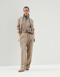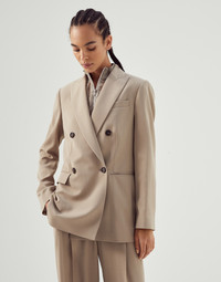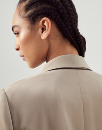 Sartorial foundations and a feminine twist: lightweight summery fabrics, distinguished craftsmanship and informal elements come together to create outfits with ease. Designed to be worn with everything and at any time of the day, blazers in a wide variety of styles and volumes are a key element in expressing new concepts of female elegance. MATERIALS A combination of the virgin wool fiber with viscose creates a fluid, ultra lightweight fabric. DETAILS Designed in Solomeo and handcrafted in Italy 54% VISCOSE, 46% VIRGIN WOOL