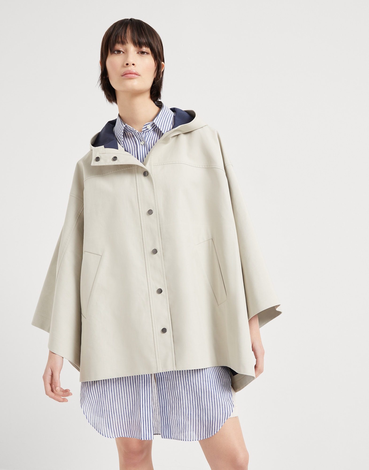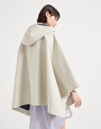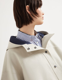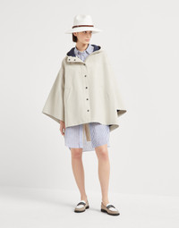 Refined Brunello Cucinelli materials enrich the style of this cotton poplin outerwear jacket. Reflecting the trapezoidal design of a classic cape, the garment is detailed in a water-resistant technical fabric. The sporty feel is enhanced by the hood, heat-sealed taping, and the zipper and buttons double closure, completing the design with practical, functional elements. A precious monili detail on the zipper pull introduces a feminine sparkle. MATERIALS The fabric is a formed by combining two poplins and is treated with a water-resistant finish on the external side, recreating the feel of a lightweight mackintosh. The heat-sealed taping gives the style a modern look. DETAILS Snap closure Hood Unlined Hand pockets Button at hem 100% COTTON
