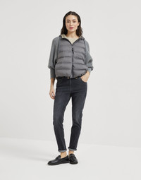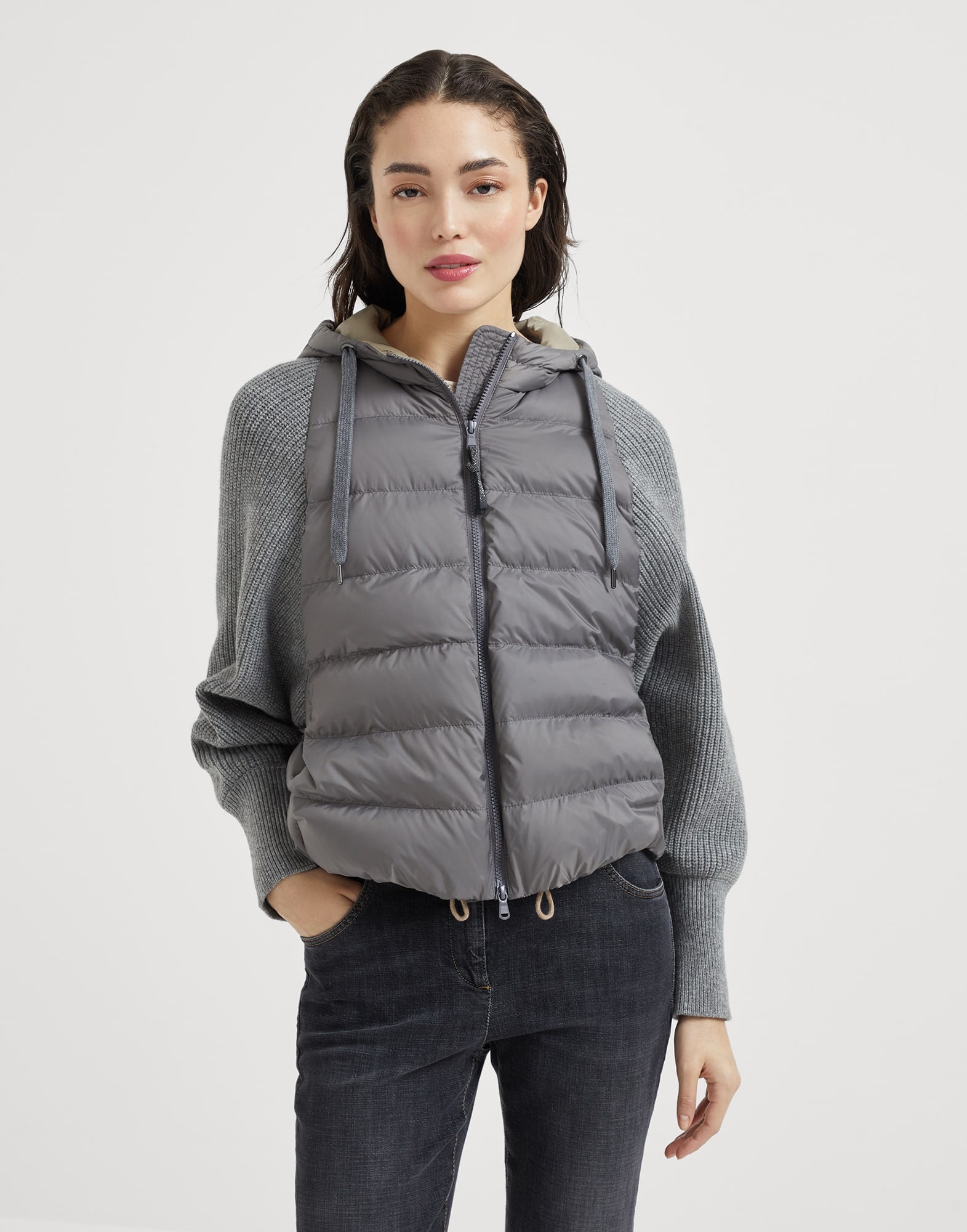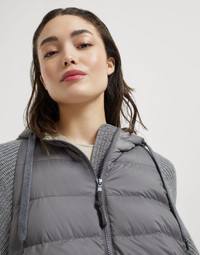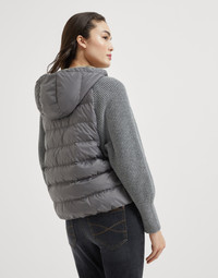 A sporty feel, versatility and elegant details come together in this new down jacket. Its water-resistant matte nylon base is paired with the ultra soft virgin wool, cashmere and silk knit that is showcased in the sleeves: the texture contrast makes this piece precious and extremely sophisticated. The practical drawstring hood completes the comfortable look of this outerwear, while a precious monili embroidery illuminates the zipper pull with a delicate sparkling note. MATERIALS Matte nylon is an ultra lightweight and thin material with a smooth hand. A finish helps to protect the fabric from the slightest contact with water. 100% POLYESTER