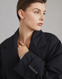 Water-resistant techno cotton updates a timeless overcoat in a contemporary way. The Thermore® padding gives the classic silhouette a nice full look, completed by the adjustable belt that highlights the feminine shape. The precious monili detail on the cuff adds a small sparkling touch. MATERIALS The refined techno cotton fabric combines the lightness and breathability of the natural fiber with a resistant and innovative structure to offer optimal comfort. The fabric is enriched with Thermore® padding, a high-quality technical material that ensures protection in the cold. The nylon lining finishes the style. DETAILS Strap closure Water-resistant nylon lining Hand pockets Single back vent Thermore® padding Nickel-free monili decoration 74% NYLON, 26% COTTON