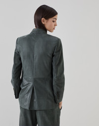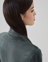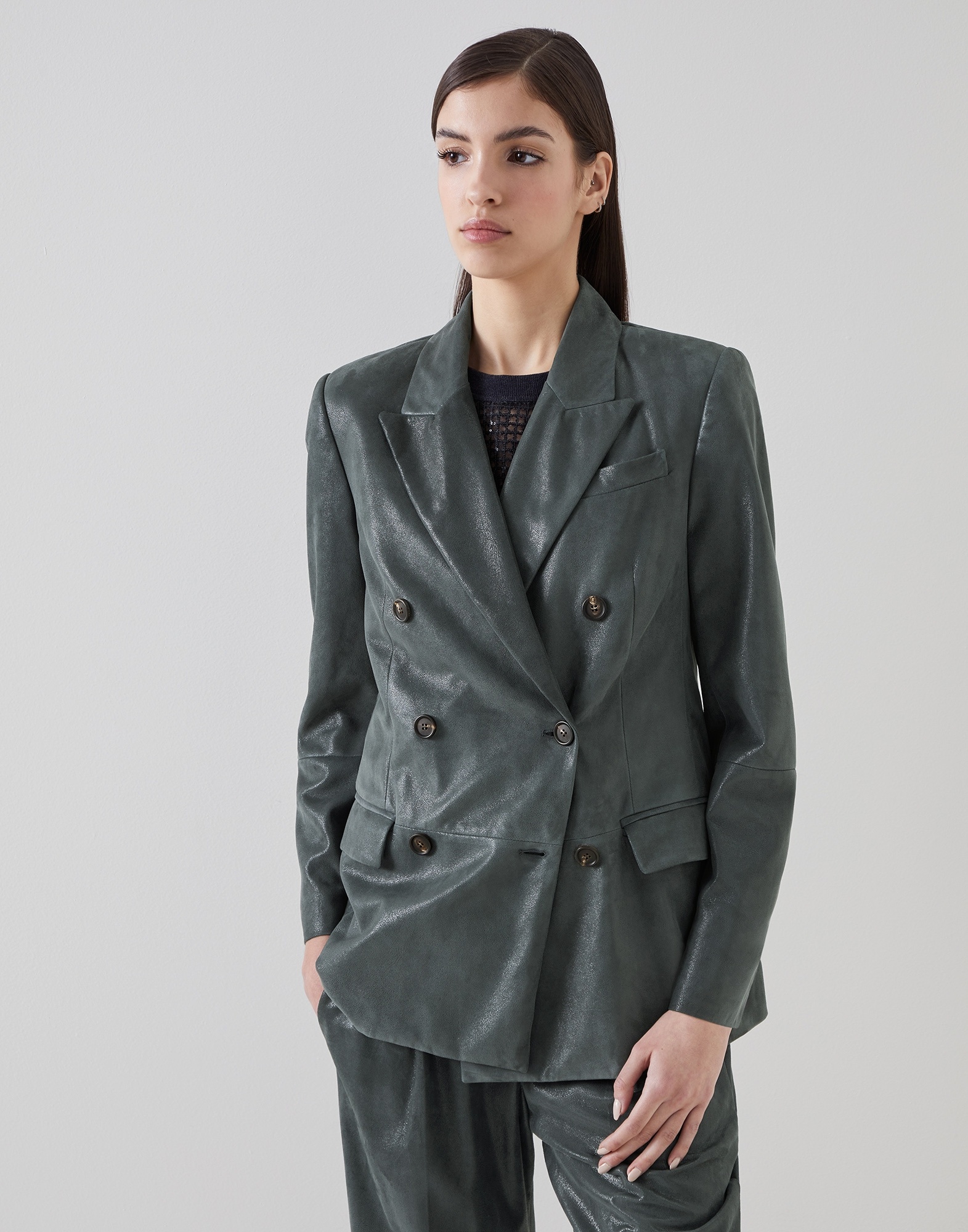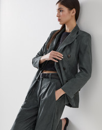 Versatility, refined materials and an elegant aesthetic pair perfectly in this Wet-Effect suede blazer. Thanks to its unique finish, the precious suede showcases a semi-shiny texture with a wet effect that gives a contemporary allure to the classic lines of the double-breasted blazer. Behind the neck, a delicate shiny monili embroidery adds a sophisticated sparkling note in true Brunello Cucinelli style. MATERIALS Lapin felt is a warm, compact fabric which guarantees protection and comfort when worn. DETAILS Horn button closure Silk-blend crêpe lining Welt pockets with flap and chest pocket Cuffs have four horn buttons Single back vent Peak lapel Nickel-free monili decoration REAL LEATHER