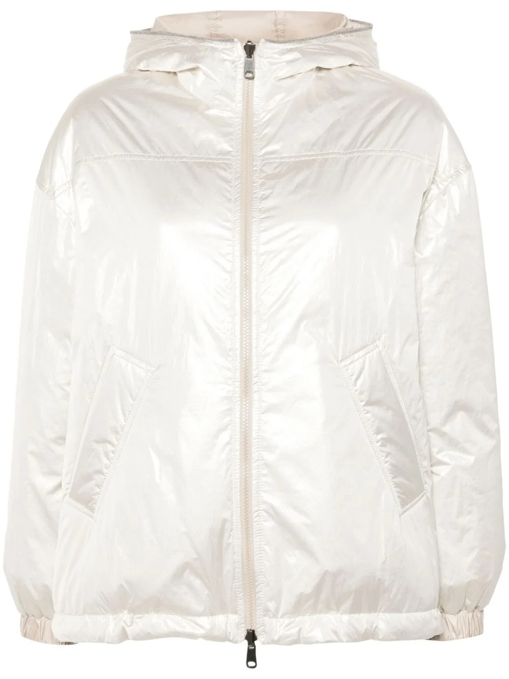 reversible metallic padded jacket Highlights - Beige - Metallic sheen - Reversible - Padded design - Goose down - Classic hood - Signature monili chain detail - Long sleeves - Elasticated cuffs - Two side welt pockets - Straight hem - Front two-way zip fastening Made in Italy Composition Lining: Polyester 100%, Polyamide 100%, Goose Down 100% Outer: Polyamide 100%, Eco Brass 100%, Polyester 75%, Metallic Fibre 25% SIZE & FIT Model measurements Height 5 ft 10 in(1.77 m) Bust/Chest 32.28 in(82 cm) Hips 35.03 in(89 cm) Waist 25.19 in(64 cm) FittingInformation Designed to be unstructured, offering a loose fit throughout The internal drawstring at the hem allows for fitted preferences Made from a padded non-stretch fabric, giving it no natural elasticity This piece fits true to size – take your usual size