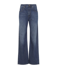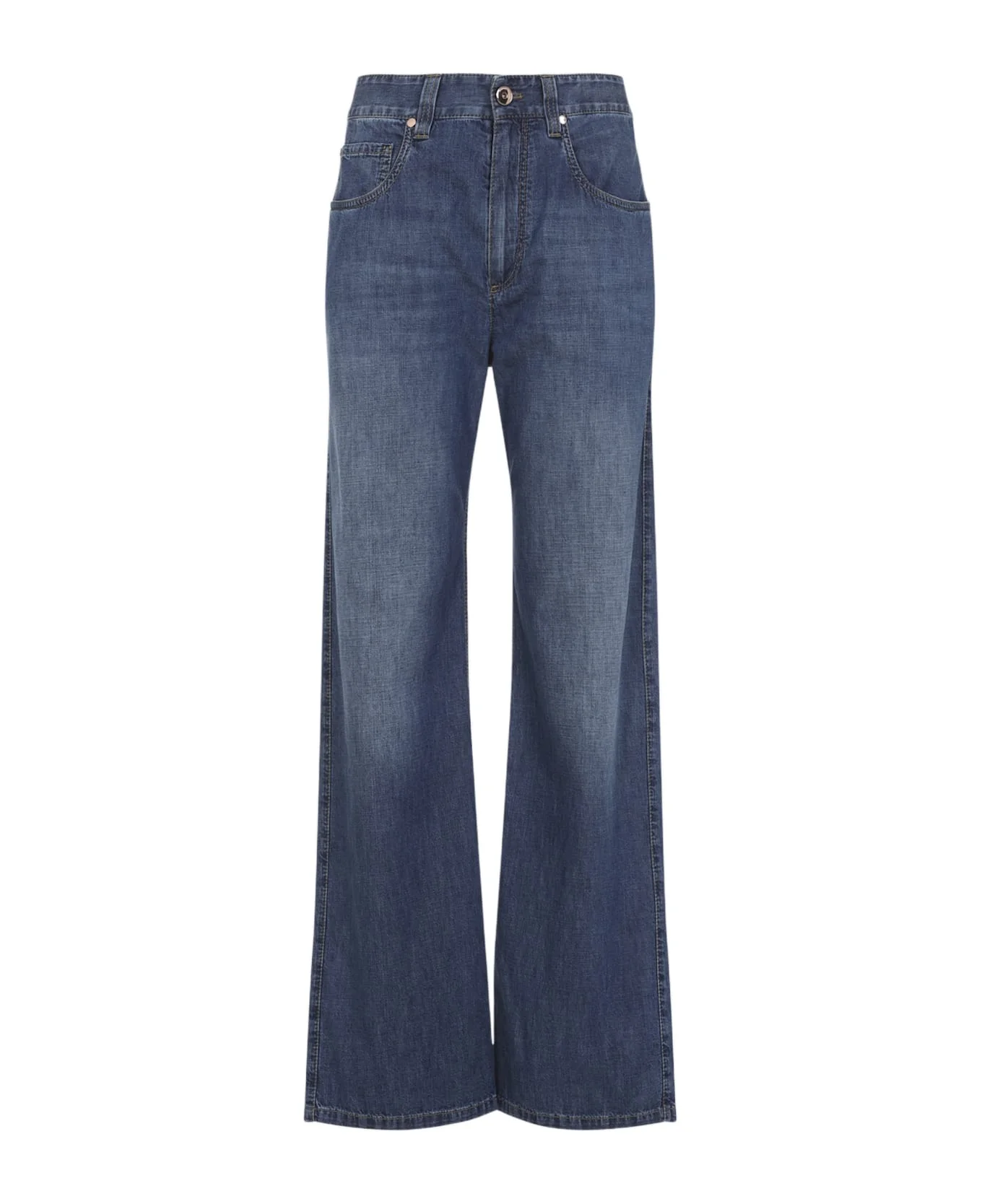 Brunello Cucinelli Essential dark Blue Cotton Wide Leg Jeans. Pure Essential dark Blue cotton jeans, front concealing zipped fastening, front buttoned fastening, belt loops, five pockets design, wide leg, straight hem, overwashed effect. Made in: Italy Color: Essential Dark Blue Model number: MH192P5565C9393