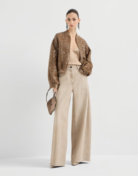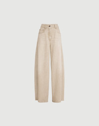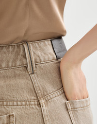 A casual fabric and generous volume define the style of these authentic denim wide trousers. The straight, relaxed and wide cut pairs perfectly with the fabric’s slightly vintage look, characterized by the faded, worn color. The informal attitude of the five-pocket silhouette is enriched with a precious monili embroidery that illuminates the rear belt loop with a delicate, feminine sparkle. MATERIALS The Authentic cotton fabric maintains the characteristically full, even texture of denim, but is also pleasantly soft and comfortable to wear. The lived-in look and special nuanced effect of the color have been created thanks to various dyes and washes. As a result, its hue may evolve and naturally lighten with washing and daily use, refined traits of the fabric itself. DETAILS Zip closure with button Front pockets with watch pocket Back patch pockets Plain hem Nickel-free monili decoration 100% COTTON