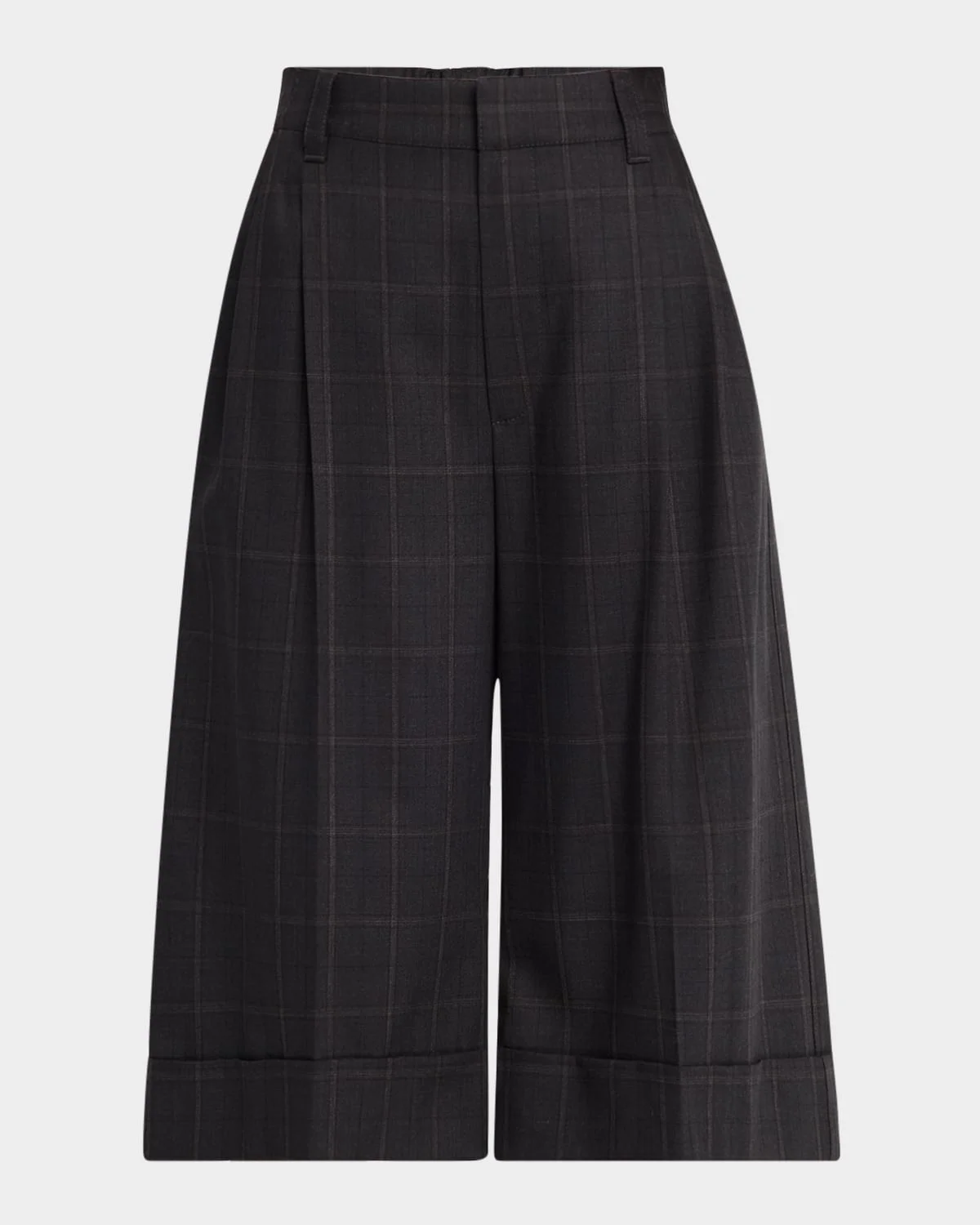 - Brunello Cucinelli Bermuda shorts in windowpane motif with front pleats - High waist - Knee length - Straight legs - Side slip pockets; back pockets - Turn-up cuffs - Tab/zip fly; belt loops - Virgin wool - Lining: Polyester/acetate/cupro - Made in Italy