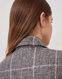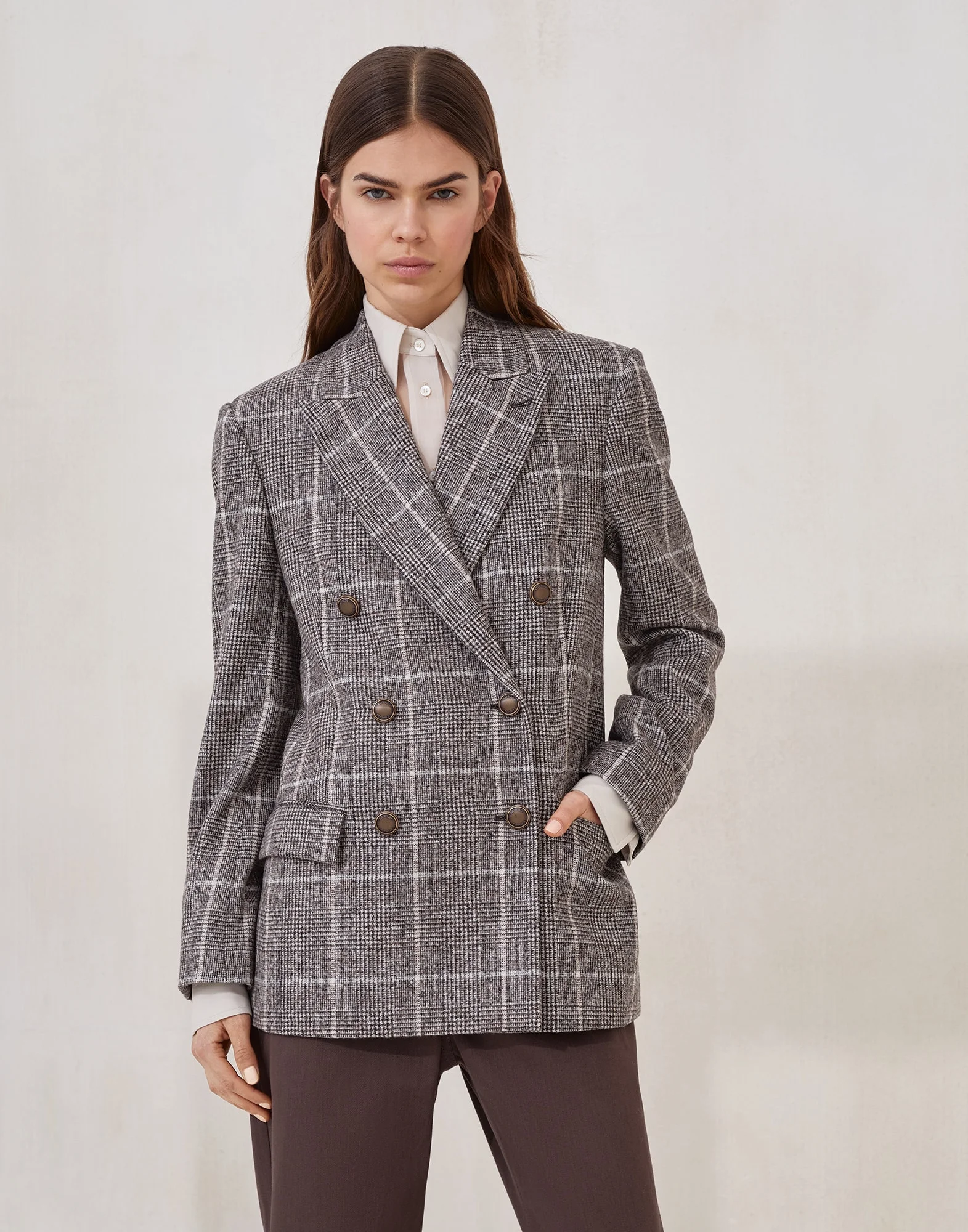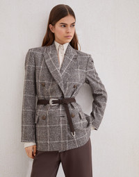 Inspired by the world of formal British dress codes, the iconic Prince of Wales pattern harmoniously complements the feminine allure of this alpaca and wool blazer. The fit showcases a slightly oversize cut, emphasized by the pronounced lapels and broad shoulders, while the double-breasted closure defines the regular silhouette. The shiny monili embroidery behind the neck complements the garment with a precious sparkling note, in true Brunello Cucinelli style. MATERIALS The refined alpaca and wool Prince of Wales fabric delivers warmth, softness and comfort when worn. DETAILS Metal button closure Silk-blend crepe lining Peak lapel Hand pockets with flap Cuffs have four metal buttons Single back vent Nickel-free monili decoration 58% ALPACA, 27% WOOL, 15% NYLON