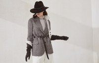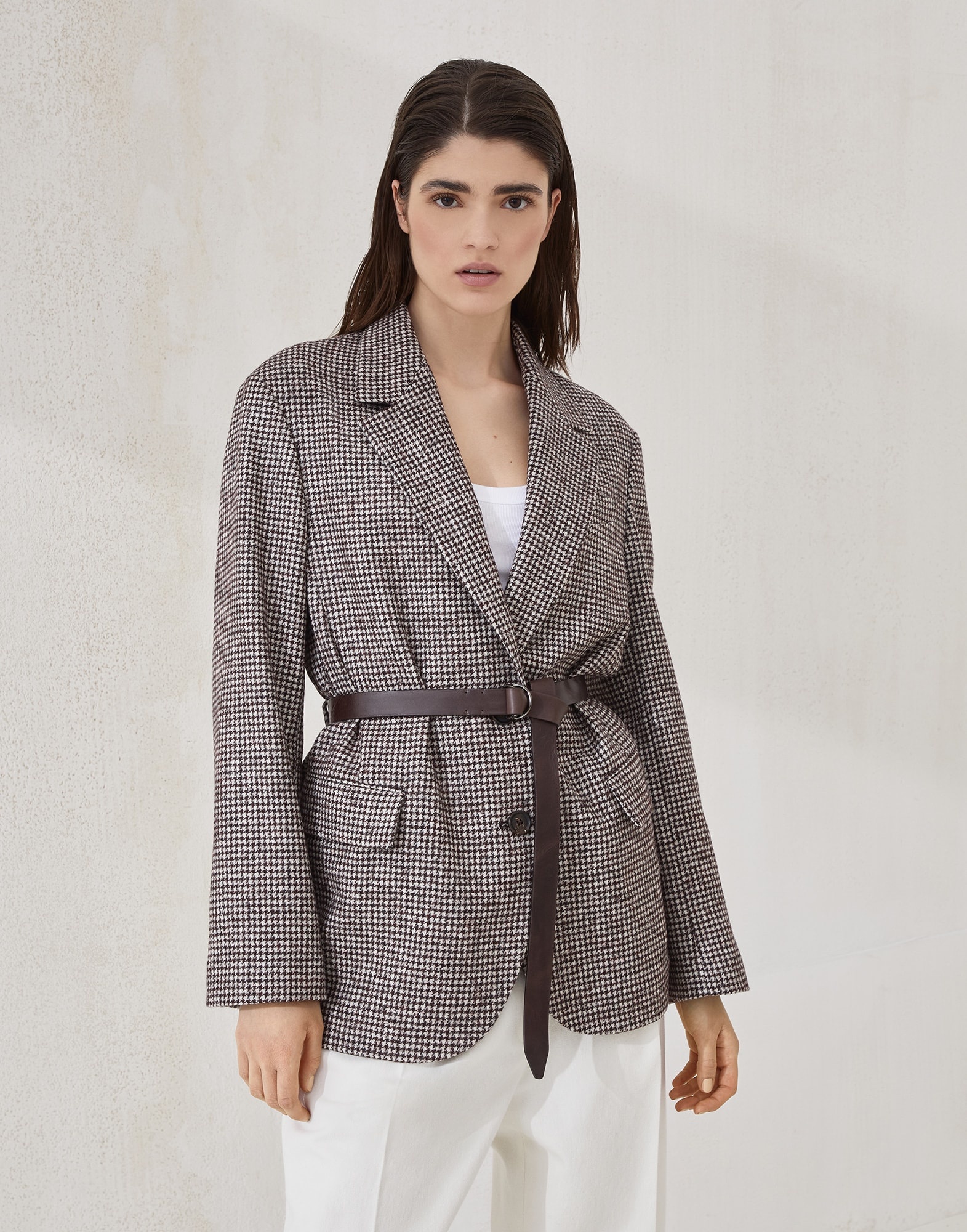 The timeless houndstooth pattern perfectly complements the feminine charm of this wool and alpaca blazer. With a sartorial allure, the garment features a stand collar detailed with a contrasting undercollar, for a refined color combination, while the leather belt, a reference to the equestrian world, harmoniously highlights the waist, gathering the silhouette’s volume. A fine row of shiny monili, the iconic embellishment of the Brunello Cucinelli collections, completes the blazer with a delicate sparkling note. MATERIALS The combination of refined natural fibers updates the retro feel of houndstooth. The luxurious wool provides a soft hand, while the airy effect of alpaca adds volume. DETAILS Horn button closure Half-lined in acetate Notched lapel Chest pocket Hand pockets with flap Cuffs have four horn buttons Detachable ring belt Single back vent Nickel-free monili decoration 58% WOOL, 33% ALPACA, 9% NYLON