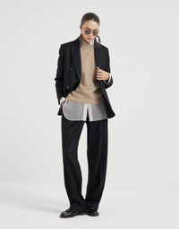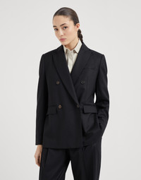 Crafted in refined virgin wool and cashmere, this flannel blazer reinterprets a timeless icon of classic apparel. The style draws inspiration from the world of tailoring and showcases a slightly oversized fit with generous shoulders, harmoniously balanced with a regular waist. The shiny monili detail adds a delicate touch of feminine sparkle. MATERIALS The manufacturing of the virgin wool and cashmere flannel enhances the noble qualities of the natural fibers, giving the fabric a warm, soft hand. DETAILS Horn button closure Silk-blend crêpe lining Chest pocket Welt hand pockets Cuffs have four horn buttons Single back vent Nickel-free monili decoration 88% VIRGIN WOOL, 12% CASHMERE