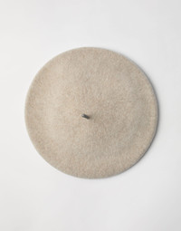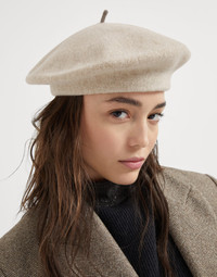 Refined materials and elegant Brunello Cucinelli details enrich this new wool beret. A distinct detail is added to its soft, cozy texture: a precious monili embroidery stands out on the end, giving this accessory a delicate and very feminine sparkling touch. MATERIALS The excellence of the natural pure wool fibers creates a soft, smooth texture and guarantees warmth and protection, traits that help to provide added comfort. DETAILS Unlined Nickel-free monili decoration 100% WOOL