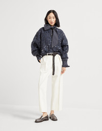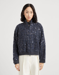 The season’s precious patterns enrich the informal attitude of this dazzling croc embroidery cardigan. The protagonist of the style is an elegant croco-effect embroidery, created by combining the natural characteristics of the yarns with the slightly three-dimensional, shiny effect of sequins, recreating a rich surface that is light and sophisticated at the same time. The silhouette is relaxed and is completed by a practical zipper closure and high neck. MATERIALS The workmanship uses refined mohair fibers, crafted together with silk and linen yarns, to ensure the embroidery’s light structure that makes up the garment’s entire surface. The sequins add a touch of sparkle and a three-dimensional effect, enriching the design. DETAILS Two-way zip closure Drop shoulder Wide sleeve Rib knit cuffs and bottom band Special workmanship 31% MOHAIR, 20% NYLON, 18% SILK, 17% LINEN, 14% POLYESTER