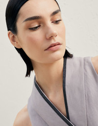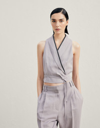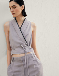 Wrap-effect vest in viscose and linen fluid twill with precious trim