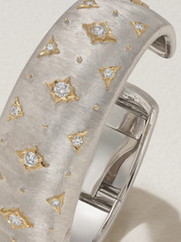 Buccellati describes its artisans as the heart and soul of the brand - it takes up to seven years of training to master the label's many signature techniques, like the 'rigato' engraving seen on this cuff. It's cast from 18-karat white gold and is adorned with ornate arrangements of diamonds nestled in 18-karat yellow gold settings. The discreet hinge allows you to slip it on and off with ease.