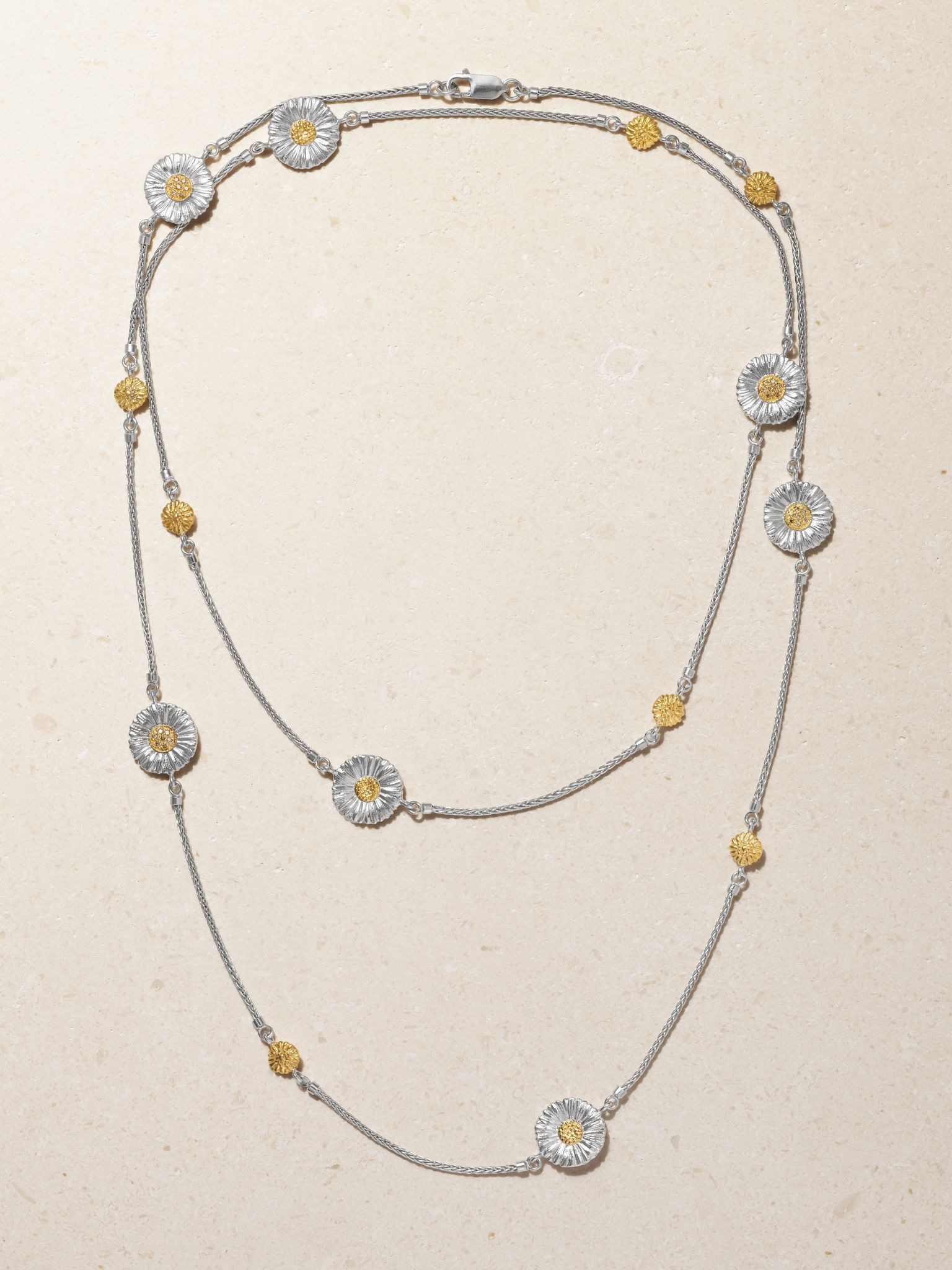 Buccellati's youthful 'Blossoms' collection marks the first ever silver line for the family-run house. Handcrafted from rhodium-plated sterling silver and gold vermeil, this necklace is adorned with daisy charms that are inlaid with tiny brown diamonds and intricately engraved using the brand's signature rigato technique to emulate petals. Style yours in a double layer or as a long, single drop. Details & Care - Brilliant-cut fancy brown diamonds, total weight: 0.50-carats - Lobster clasp fastening - Comes in a presentation box - This piece has been certified in accordance with the Hallmarking Act 1973