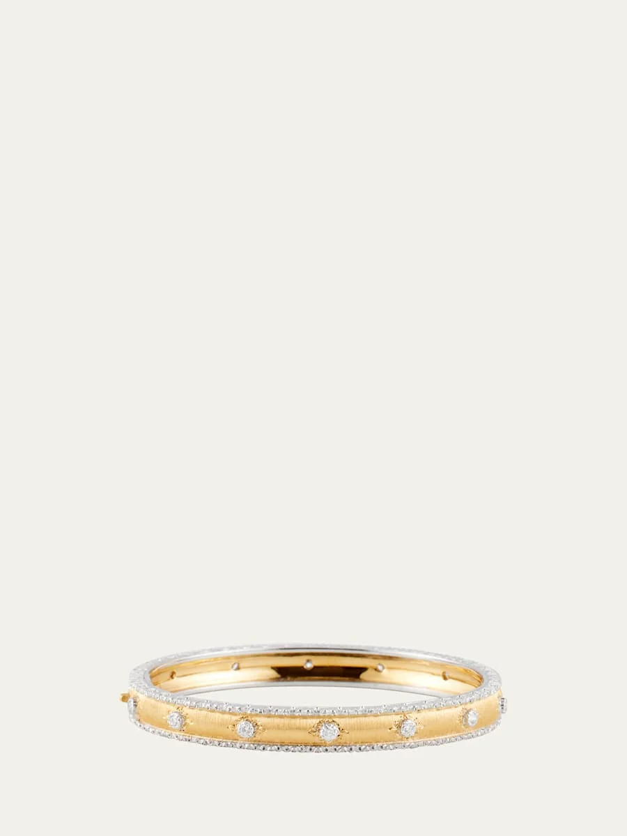 Buccellati bracelet 18karat handengraved yellow and white gold Roundcut white diamonds Total diamond carat weight: 0.48 Hinged opening with box clasp Made in Italy