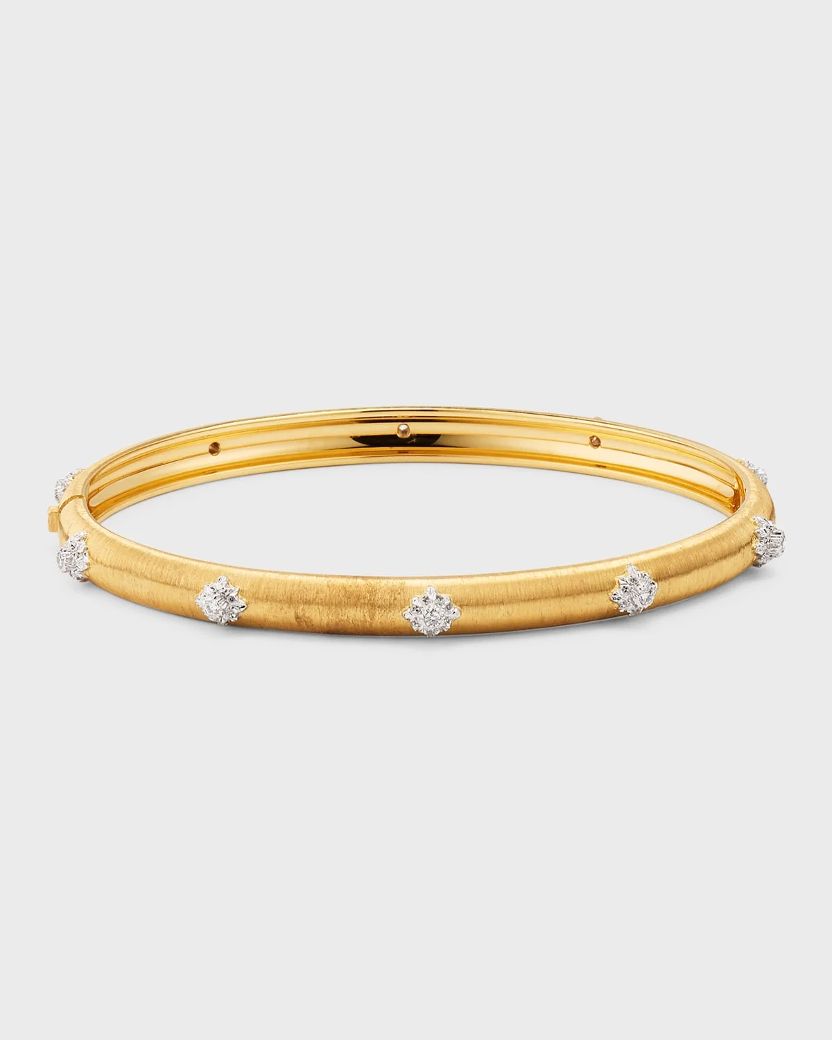 • Macri bangle bracelet by Buccellati • Hand-engraved 18-karat yellow gold • Ten round white diamonds • 0.15 total carat weight • Slip-on style • Made in Italy Online Inquiries: NMS21_PEBKQ Store Inquiries: #4419353
