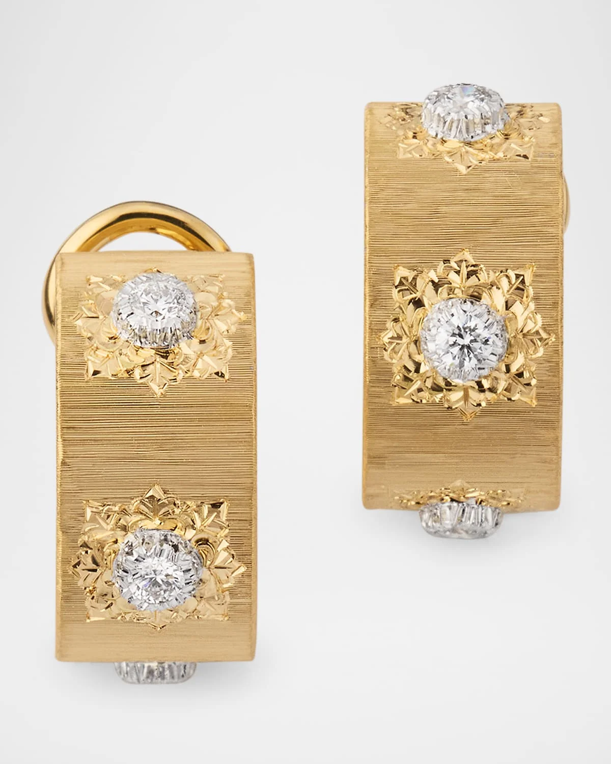 - Buccellati huggie earrings are hand-engraved with a rigato effect and feature six diamonds in rosette settings - 18-karat yellow gold - 0.3 total carat weight - Omega clips for support - For pierced ears - Made in Italy