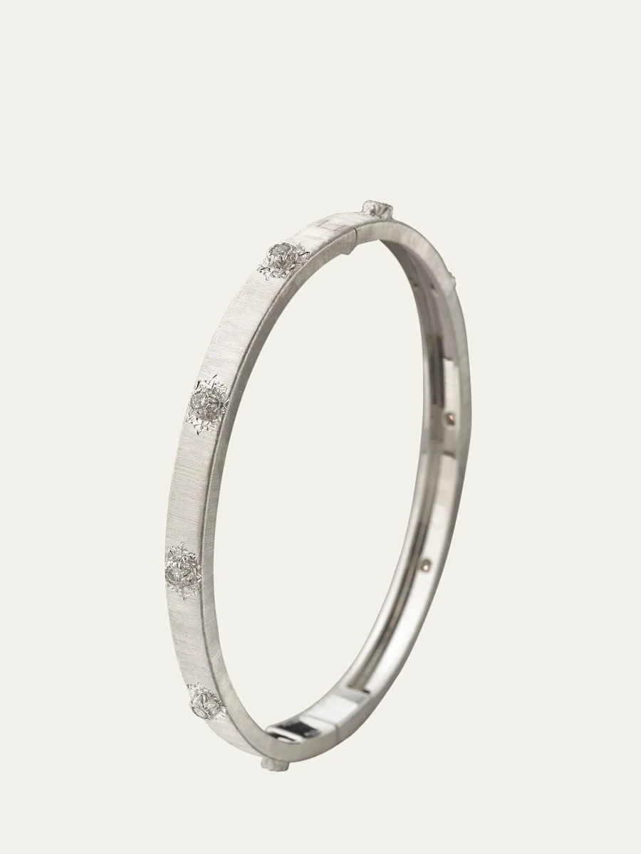 This bangle bracelet by Buccellati is designed with the rigato effect, obtained by handmade engraving and adorned with brilliantcut diamonds set in tiny starshaped rosettes From the Macri Collection Approx. 5mm width 18karat rhodiumplated white gold 10 round white diamonds 0.20 total diamond carat weight Slipon style Made in Italy