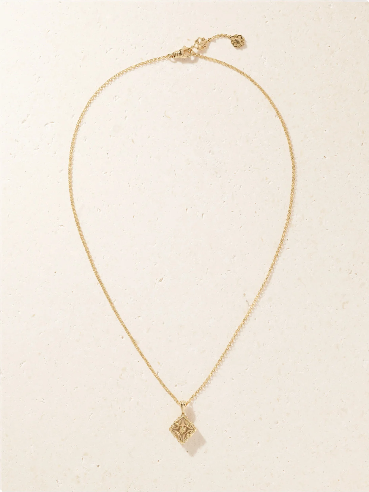 Buccellati's 'Opera Tulle' necklace captures the house's intricate artistry in miniature form. The pendant layers mother-of-pearl beneath a sunburst tulle motif, made from an 18-karat gold rosette framed by scalloped edges.