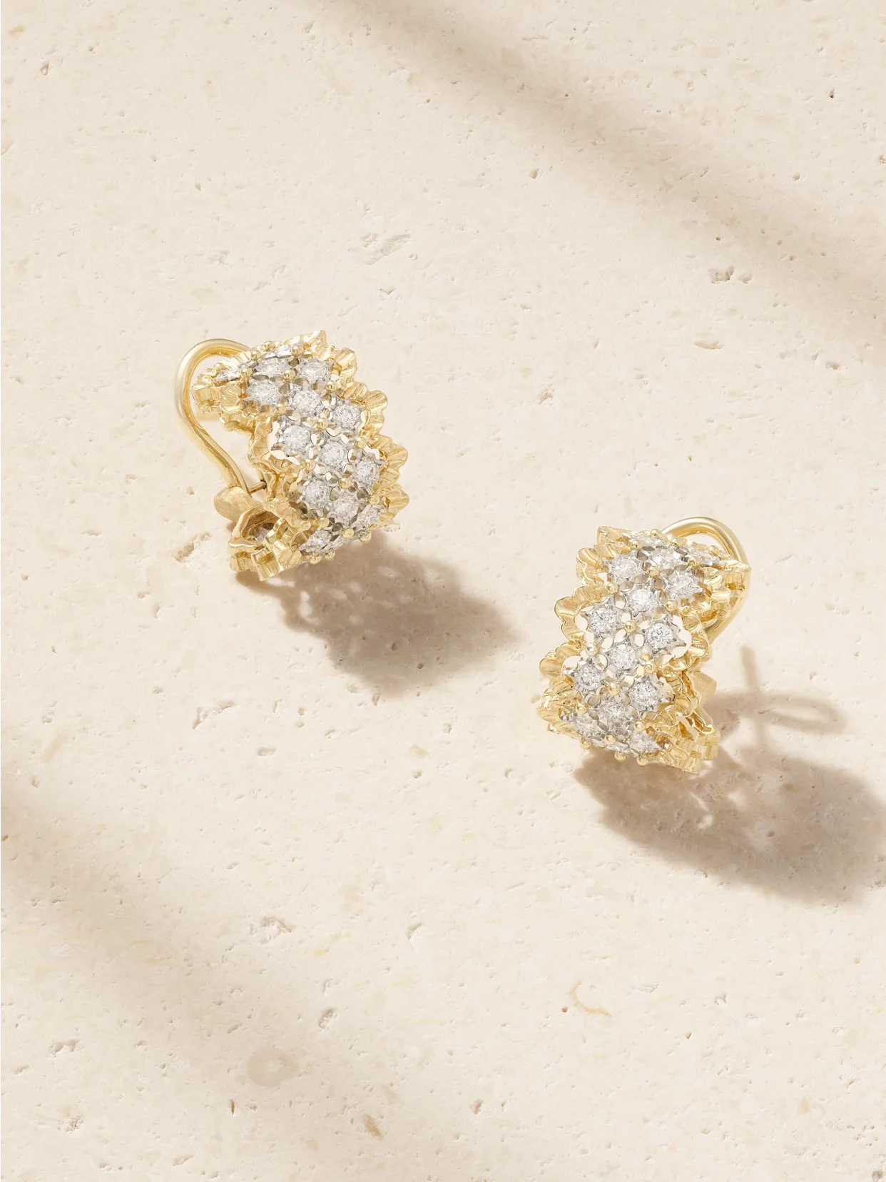 Buccellati's designs are the result of over a century of jewelry-making expertise. Handcrafted from 18-karat yellow and white gold in an intricate pattern, these 'Rombi' earrings are encircled with shimmering round-cut diamonds through the center.