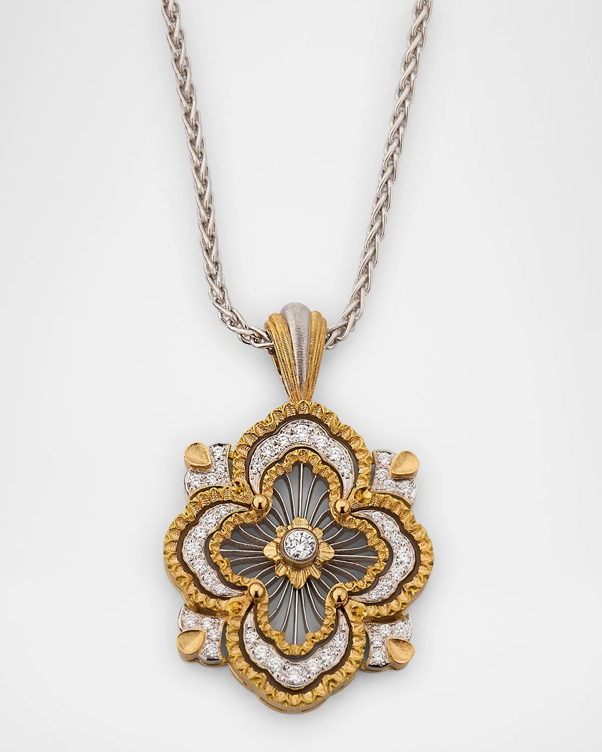 • Buccellati pendant necklace • 18-karat yellow and white gold • Round white diamonds • Diamond total carat weight: 0.33 • Lobster clasp • Wipe clean • Made in Italy Online Inquiries: NMS21_PEJ5H Store Inquiries: #4460220