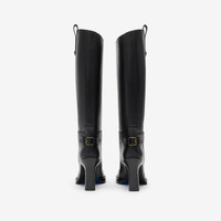 Product Details Grounded in our heritage of outdoor pursuits, the Cavalier boots are made in Italy from smooth calf leather. The knee-high, column silhouette features pull tabs and buckled ankle straps – inspired by equestrian styles and reworked with a heel. Our Equestrian Knight Design is moulded at the sole in signature Knight Blue. - Rounded toe - Equestrian Knight Design at sole - Engraved Burberry lettering at buckle - Comes with a dust bag - Item 81144061 Size & Fit - Heel height: 8.5cm/3.4in. Length from top of heel to top of boot: 38cm/15in. Top circumference: 36.5cm/14.4in Fabric & Care - Upper: 100% calf leather - Trim: 50% copper, 50% zinc alloy - Lining: 90% calf leather, 6% polyester, 4% polyurethane - Sole: 90% calf leather, 6% thermoplastic polyurethane, 4% ABS - Made in Italy