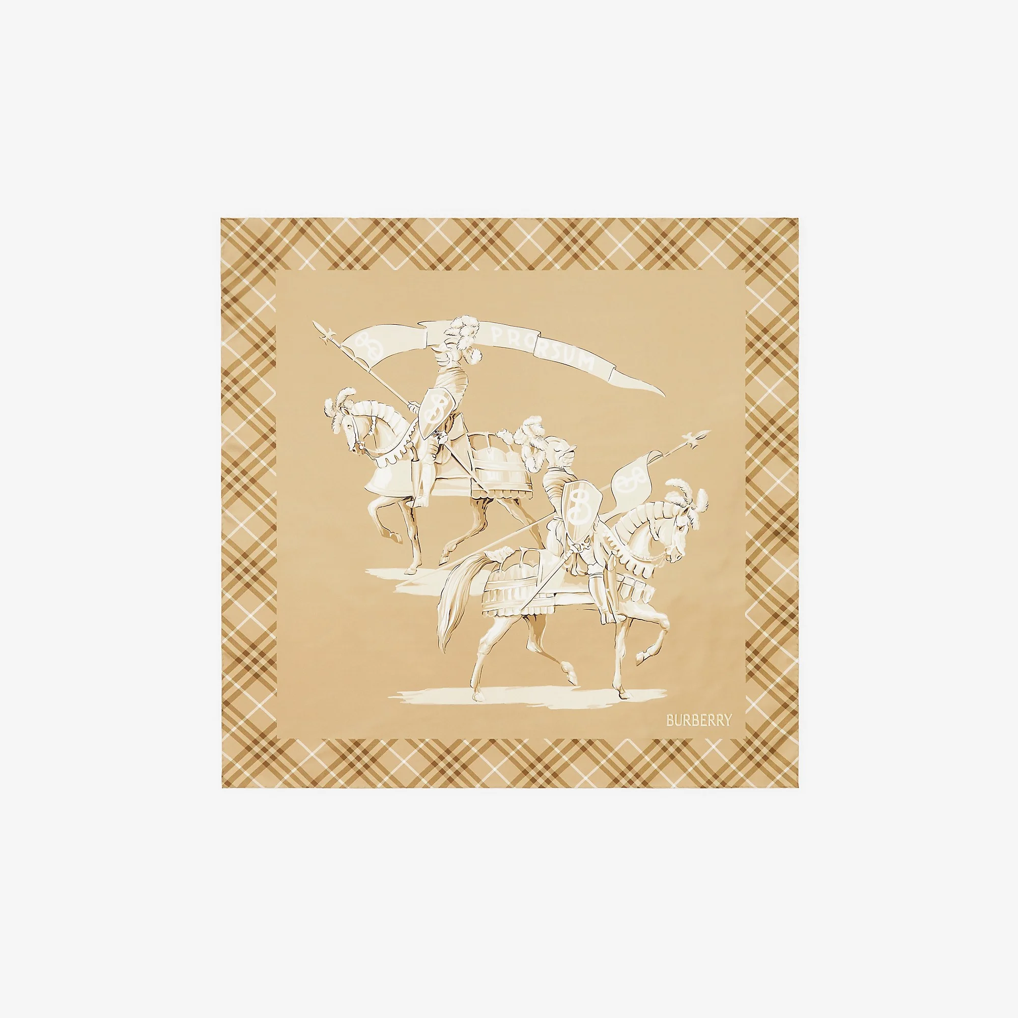 Product Details A square scarf in silk twill, featuring an archival-inspired print in seasonal finch beige. The watercolour-style artwork depicts our Equestrian Knight Design and is framed by a Burberry Check border. - Square - Hand-rolled edges - Printed Burberry lettering at corner - Item 81258151 Size & Fit - 90 x 90cm/35.4 x 35.4in Fabric & Care - 100% silk - Specialist dry clean - Made in Italy