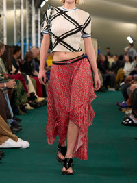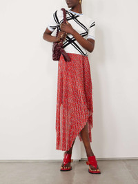 EDITORS'NOTES Worn on the Spring '24 runway, Burberry's skirt is patterned with clasps that mimic the ones on the house's 'Rocking Horse' bags. It's made from plissé-twill and falls to a swishy, asymmetric hem. Mirror the show styling and wear yours with cropped tops. SIZE & FIT Model measurements: - Fits very large to size, take two sizes smaller than normal - Asymmetric hem, designed to be worn at the waist - Lightweight, non-stretchy fabric - Model is 177cm/ 5'10" and is wearing a UK 2 - Bust: 79cm/ 31" - Waist: 61cm/ 24" - Hip: 89cm/ 35" DETAILS & CARE - Multicolored plissé-twill - Slips on - 100% polyester - Dry clean Large to size. See Size & Fit notes.