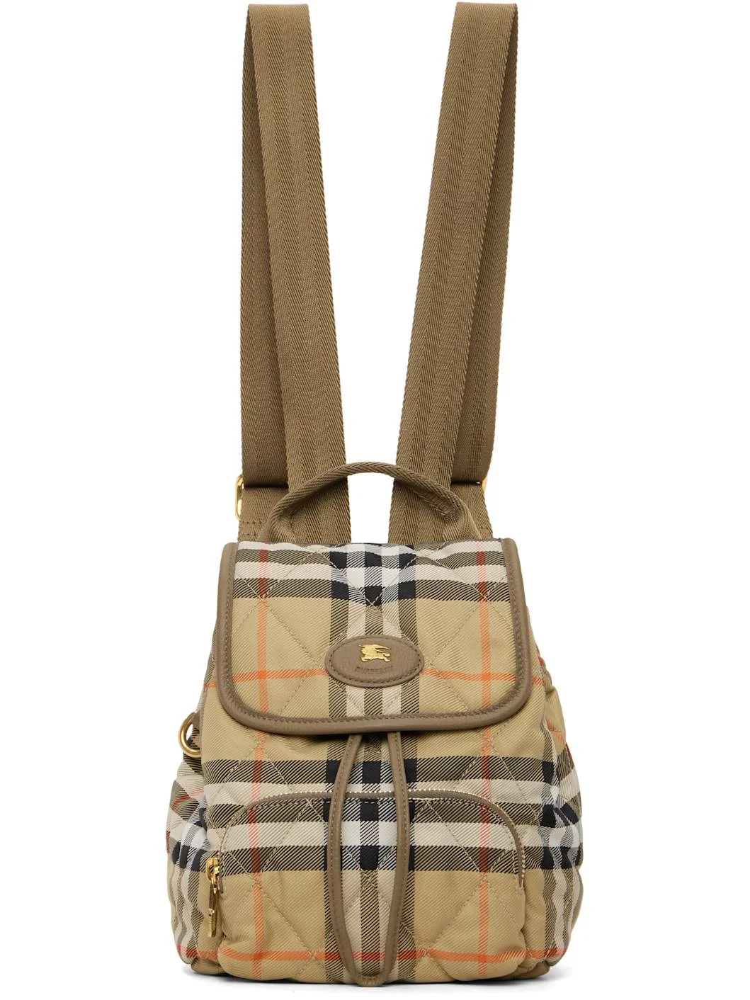 Quilted twill backpack. · Check pattern and grained calfskin trim throughout · Rolled carry handle · Adjustable shoulder straps · Zip pocket at face · Logo patch at magnetic foldover flap · Drawstring closure · Patch pocket at interior · Sateen lining · H9" x W7.5" x D4" Supplier color: Sand beige Textile. Made in Romania 261376F042000