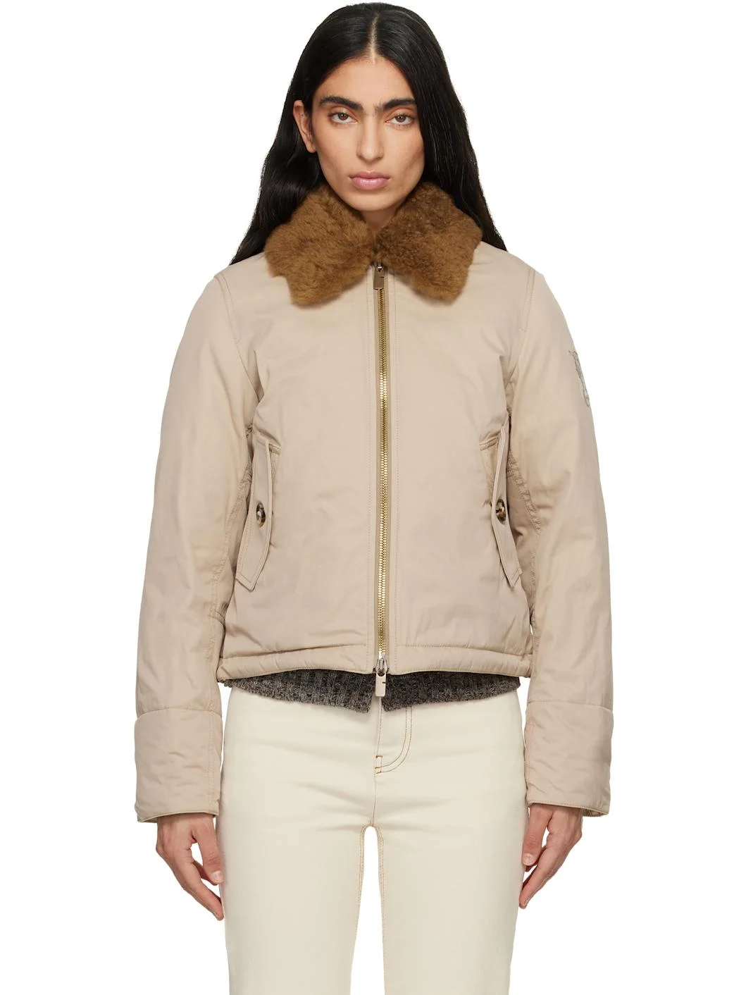 Down-filled cotton-blend gabardine bomber jacket. · Detachable shearling trim at spread collar · Two-way zip closure · Flap pockets at front · Cord-lock drawstring at hem · Logo graphic embroidered at sleeve · Velcro tab at cuffs · Inset rib-knit cuffs · Full quilted and twill lining Supplier color: Dune beige Body: 68% cotton, 32% polyamide. Trim: 87% wool, 6% polyamide, 5% cashmere, 2% elastane. Trim 2: 100% lambskin. Fill: 80% greylag goose grey down, 20% greylag goose grey feathers. Lining 1: 100% polyester. Lining 2: 100% cotton. Made in Bulgaria 261376F058000