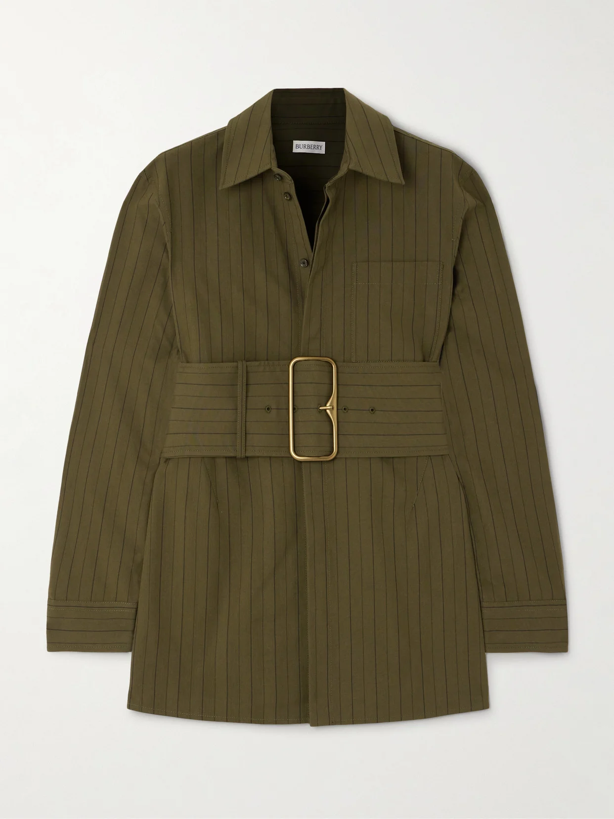 The focal point of Burberry's otherwise classic shirt is the unexpected belt, with its dramatic proportions and gleaming gold-tone buckle subtly cast in the shape of a 'B'. It's made from cotton-poplin with elongating pinstripes and has a partially concealed placket and neat collar.