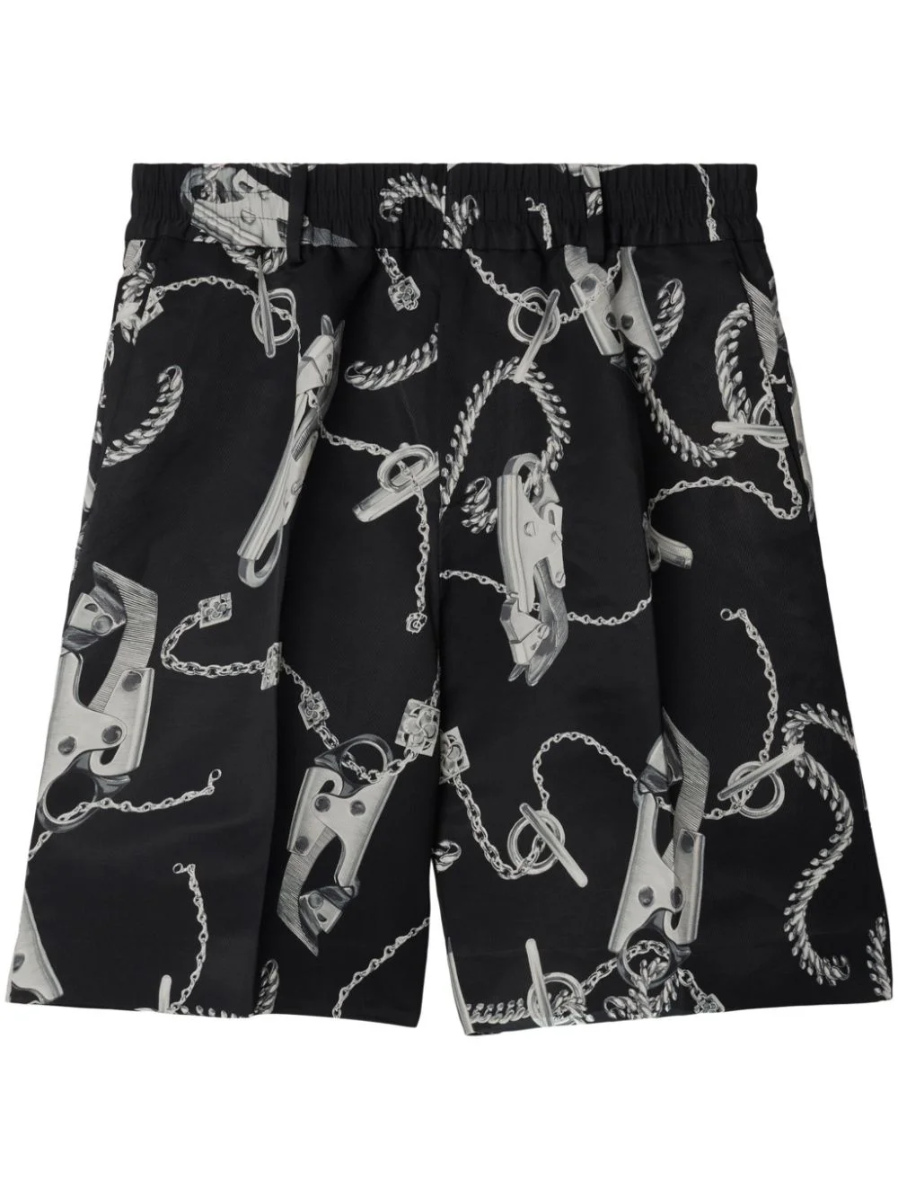 chain link-print straight-leg shorts Highlights - Black/silver-tone - Chain-link print - Pleat detailing - Belt loops - Elasticated waistband - Straight leg - Two side slash pockets - Rear welt pocket - Knee-length Made in Italy Composition Paper 71%, Viscose 29%