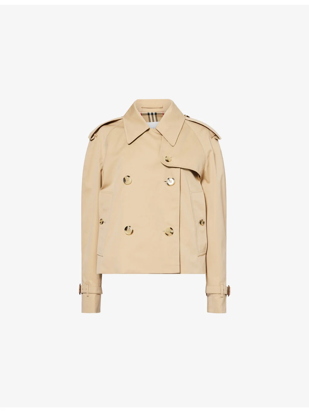 PRODUCT DETAILS - Burberry cotton jacket - 100% cotton - Button fastening at front - Boxy fit, pointed collar, epaulettes, long sleeves, adjustable cuffs at cuffs, welt pockets at front, fully lined - Dry clean - Made in UK - True to size - Size UK 8: length 21in / 53cm - Model is 5ft 10in/1.78m and wears a size UK 8 - Midweight, non-stretch Ref: R04562940