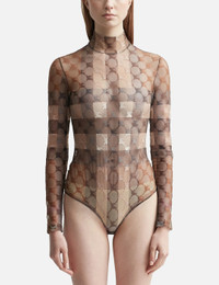 - Burberry - EKD Check Stretch Tulle Turtleneck Bodysuit - Fitted - Sheer design - Turtleneck - Long sleeves - Snap closure at the gusset - Iconic Burberry Check and latticed Equestrian Knight Design allover - Hidden zip at the rear - Color: Dark Birch Brown - Material: 79% Polyamide, 21% Elastane - See more Bodysuits and Clothing SIZING - Model wears size S - Model measures: Height 181cm, Chest 33”/84cm, Waist 24”/61cm, Hip 35”/90cm