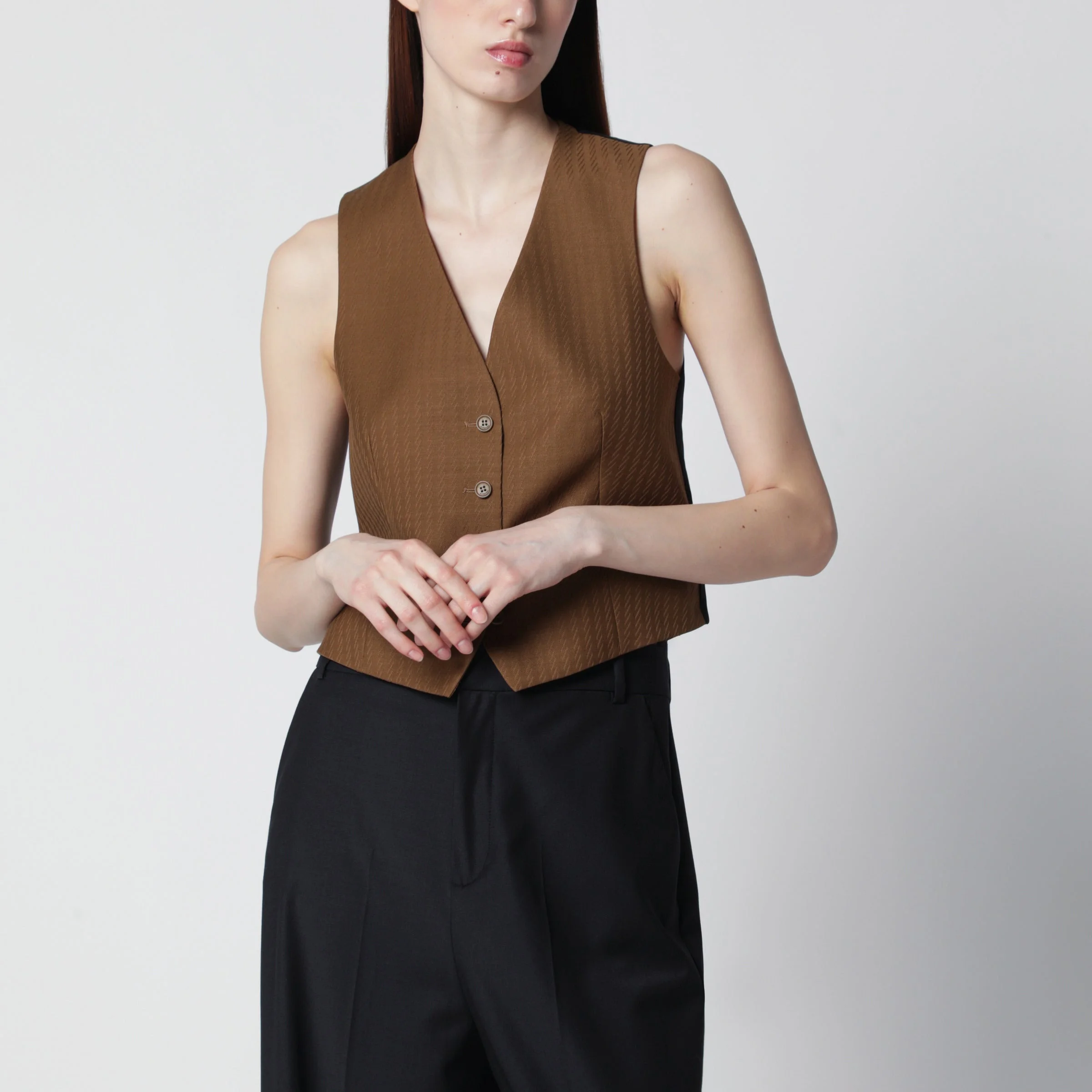 Vest by Burberry in wool and mohair• Color: Hazelnut brown• Front button closure• V-neck• Slim fit• Tone-on-tone jacquard stripes• Contrasting smooth back panel