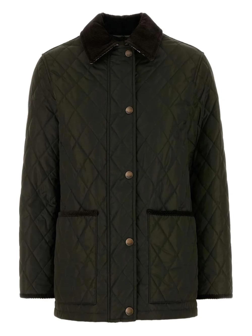 Nylon technical satin jacket. · Insulated and quilted · Corduroy spread collar · Zip closure with press-stud placket · Patch pockets at waist · Corduroy trim at pockets and cuffs · Logo flag at side seam · Check-patterned cotton twill lining · Antiqued gold-tone hardware Supplier color: Shale/Brush check Body: 100% nylon. Fill: 100% polyester. Lining: 100% cotton. Made in Thailand 252376F063011