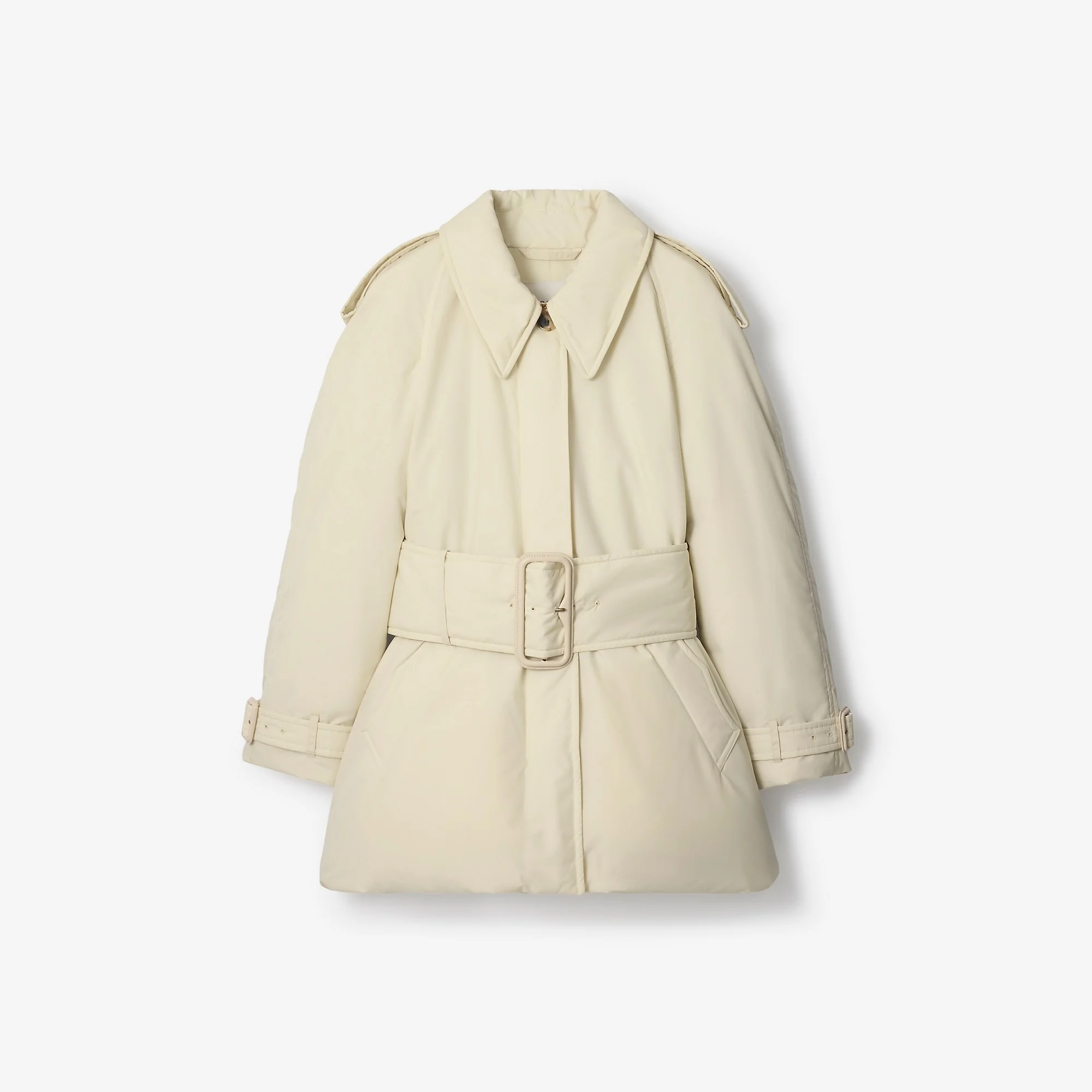 Product Details Reimagining our signature rainwear, the Berryhill car coat is cut to a shorter length and padded with goose down and feathers. Shaped with wide sleeves and a fuller skirt, the relaxed silhouette features an oversized belt to emphasise the waist. The undercollar is embroidered with a tonal check pattern and the curlicue shape of the pockets is inspired by an archival trench. - Button closure - Hook collar closure - Epaulettes - B buckle belt - Side welt pockets - Belted cuffs - Comes with a garment bag - Relaxed fit: a looser cut than our regular fit. - Machine wash - Item 81167341 Size & Fit - Length: 83cm/32.7in (size UK S) Fabric & Care - Outer: 100% polyester - Trim: 100% leather - Lining: 100% polyester - Filling: 80% goose down, 20% goose feathers - Buckles: 100% calf leather - Buttons: buffalo horn - Imported