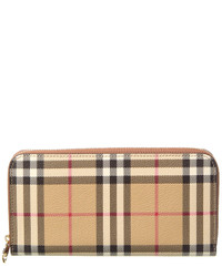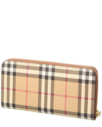 - About the brand: Iconic patterns, materials and silhouettes have made Burberry a coveted luxury staple since 1856. From waterproof, patented gabardine fabric to the unmistakable vintage check and the more modern monogram pattern, Burberry boasts undeniably British influence with timeless appeal. - Check E-Canvas & Leather Zip Around Wallet in archive beige E-canvas with gold-tone hardware - Interior design details: leather lining, zippered pocket, card slots, bill compartments - Measures 7.5in wide x 4in high x 1in deep - Zipper closure - Please note: All measurements were taken by hand and are approximate; slight variations may occur. - Our products are 100% genuine. In some cases we purchase merchandise from trusted independent suppliers and not directly from the brand owner. In all cases we stand by the authenticity of every product sold on our site. - WARNING: - CA Residents - Prop 65
