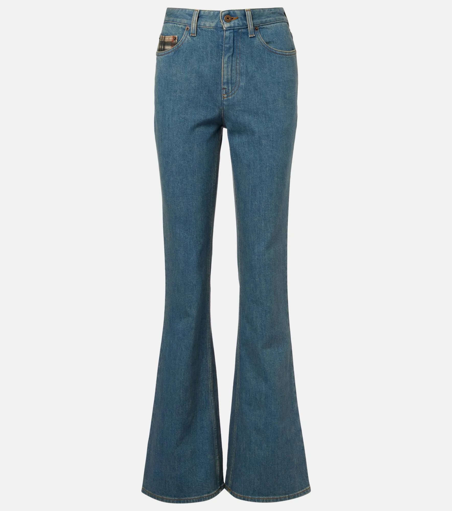 Founded in 1856, Burberry has built a reputation as a British heritage brand with unparalleled craftsmanship and groundbreaking innovation. These jeans are cut to a flared silhouette with a Burberry Check detail on the front pocket. Product Details - Material: 98% cotton, 2% elastane - Care instructions: machine wash at 30 degrees - Made in Romania - Color: blue - Designer color name: Mid Blue - Lining: 65% polyester, 35% elastane - Closure: zipper fly, button fastening - Pockets: five pockets - Belt loops - Item number: P01143357 Size & Fit - True to size - Non-stretchy fabric - Slim-leg with a flared hem - Mid-rise - The model seen in the picture is 178cm-5'10" and wearing a size 26