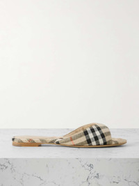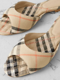 EDITORS'NOTES Burberry's slides are made from linen and woven with the label's iconic checks. They have square toes and smooth leather linings, as well as heel pads for added comfort. SIZE & FIT - Fits true to size, take your normal size - Italian sizing DETAILS & CARE - Slight heel - Multicolored linen - Slip on