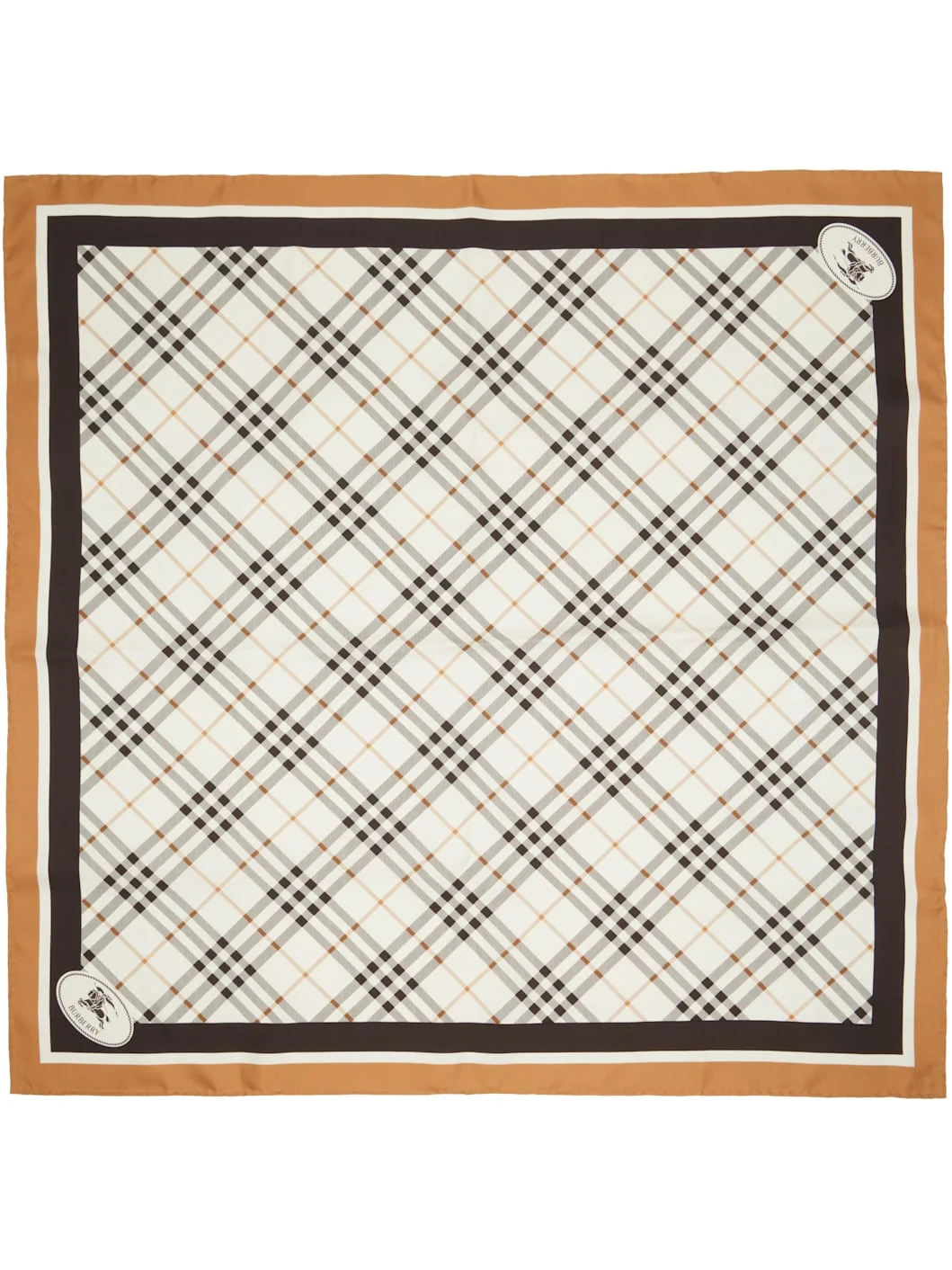 Square silk twill scarf. · Check pattern throughout · Logo printed at face · L35.5" x W35.5" Supplier color: Pebble white 100% silk. Made in Italy 261376F029018