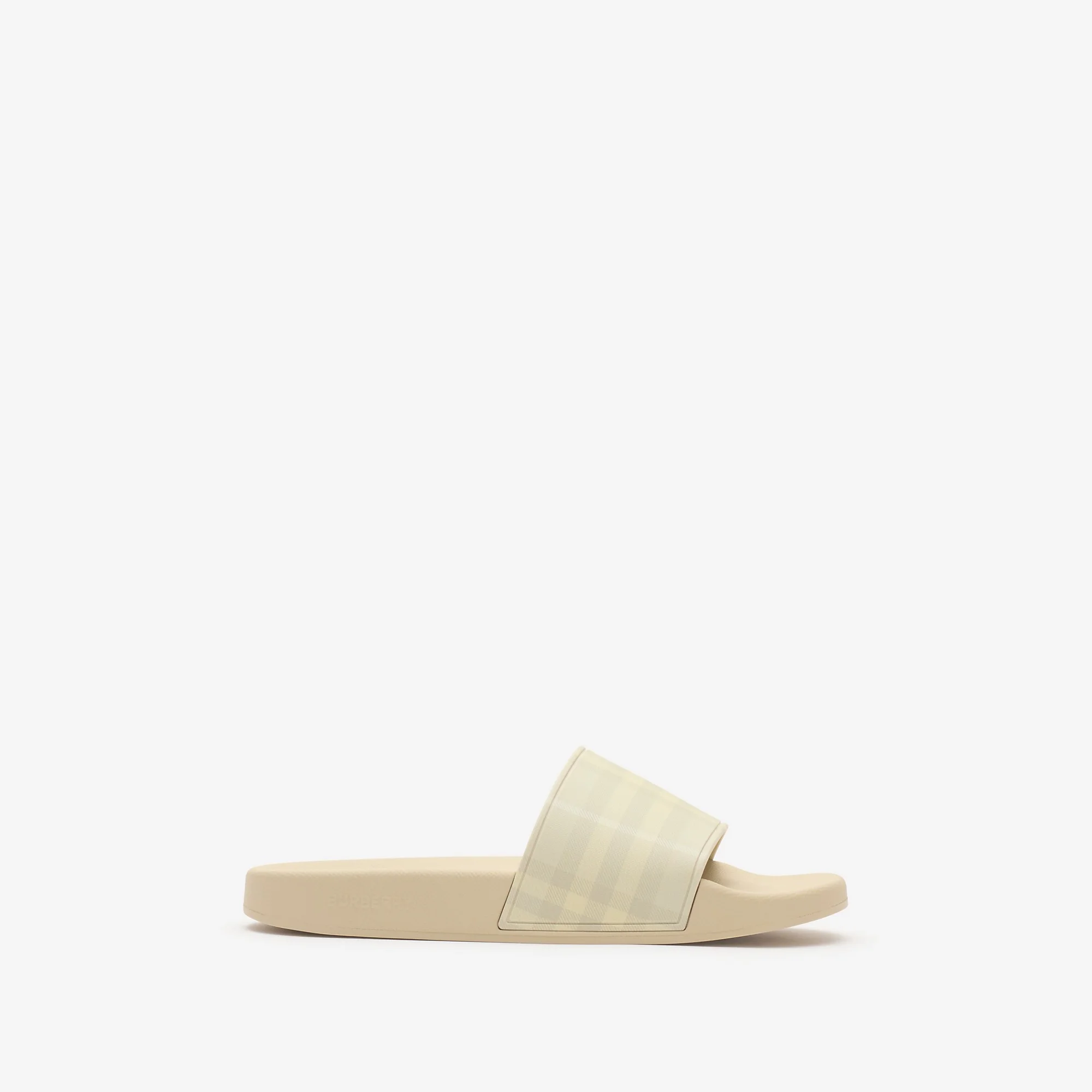 Product Details A pair of slides made in Italy, printed with the Burberry Check in a seasonal colourway. The ridged sole is debossed with our logo. - Contoured insole - Embossed Burberry lettering at side - Comes with a dust bag - Item 81141211 Fabric & Care - Upper: 100% polyurethane - Sole: 60% polyurethane, 40% thermoplastic polyurethane - Made in Italy