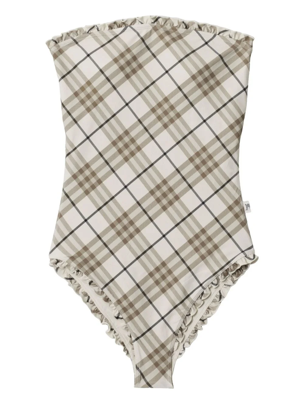 checked swimsuit Highlights - Light beige - Ruffled detailing - Strapless - Be mindful to try on swimwear over your own garments. Imported Composition Outer: Polyamide 80%, Elastane 20% Lining: Polyamide 80%, Elastane 20%